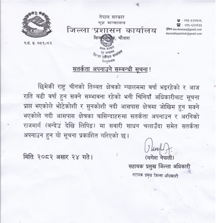 काठमाडौँ । छिमेकी राष्ट्र चीनको तिब्बत क्षेत्रको न्यालममा भारी वर्षा भएको सूचना आएको भन्दै जिल्ला प्रशासन कार्यालय सिन्धुपाल्चोकले भोटेकोशी र सुनकोशी नदी आसपासका क्षेत्रमा सतर्कता अपनाउन आग्रह गरेको छ ।