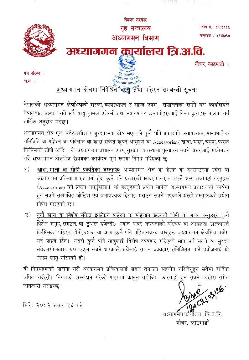 नियम सम्पूर्ण यात्रु, ट्राभल एजेन्सी तथा म्यानपावर कम्पनीका लागि लागू हुने छ। अध्यागमन प्रक्रियामा सहभागी हुँदा वा काउन्टरमा रहँदा कुनै पनि प्रकारको खादा, माला वा अन्य सजावटी वस्तु (एक्सेसोरिज) प्रयोग गर्न नपाइने भनेको हो।