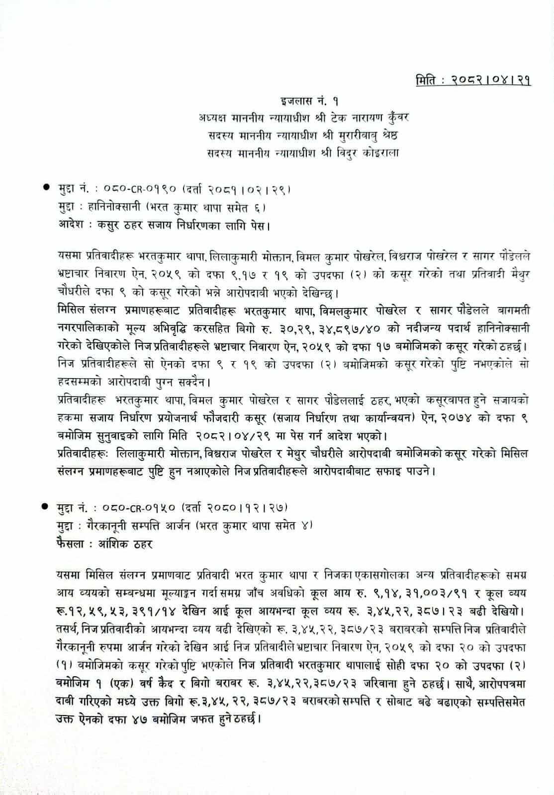 अदालतले लिलाकुमारी मोक्तान, विश्वराज पोखरेल र मेथुर चौधरीलाई भने सफाइ दिएको छ। अदालतले थापालाई गैरकानूनी सम्पत्ति आर्जन गरेको मुद्दामा पनि दोषी ठहर गरेको छ ।